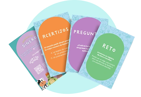 Adquiere nuestro juego familiar con tres tipos de cartas. Resuelve acertijos, preguntas y retos para aprender sobre el dinero de forma divertida y sin tabúes.
